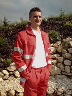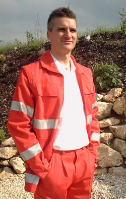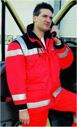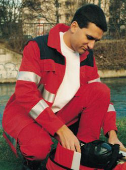 Anorak, fluoreszierendes leuchtrot (RAL 3024) mit schwarzem oder dunkelblauem Schulterkoller aus Trevira CS, Hovatex-Klimamembrane, 3M-Reflexstreifen silber umlaufend am Unterarm, Oberarm und Schulter, zwei innenliegende Brusttaschen mit Patte und Druckknöpfen, zwei aufgesetzte Seitentaschen mit Patte und Druckknöpfen, eine Ärmeltasche mit Patte und Klettverschluß, verdeckter 2-Wegereißverschluß, Taillienkordelzug, mit Reißverschluß einziehbares Thermosteppfutter, Kapuze im Kragenbund, nicht abtrennbar, Krageninnenseite schwarz, bzw. dunkelblau, Ärmelbündchen schwarz, bzw. dunkelblau mit Klettverschluß stufenlos verstellbar, Flauschband zum Anbringen eines Rücken- und Namenschildes,