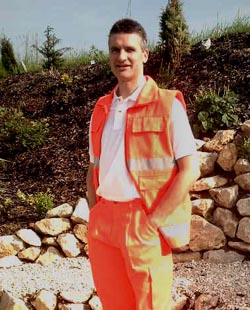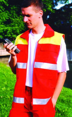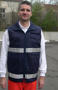 Sommerweste, rot oder marine, aus 65% Polyester/35% Baumwolle, 3M-Reflexstreifen silber, zwei innenliegende Brusttaschen mit Patte und Klettverschluß, zwei aufgesetzte Seitentaschen mit Patte und Klettverschluß, eine Innentasche links mit Reißverschluß, Flauschband zum Anbringen eines Rücken- und Namenschildes, Wasser- und Schmutz abweisend,