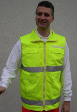 Sommerweste, floureszierendes neongelb aus 65% Polyester/35% Baumwolle, 3M-Reflexstreifen silber, zwei innenliegende Brusttaschen mit Patte und Klettverschluß, zwei aufgesetzte Seitentaschen mit Patte und Klettverschluß, eine Innentasche links mit Reißverschluß, Flauschband zum Anbringen eines Rücken- und Namenschildes, Wasser- und Schmutz abweisend,