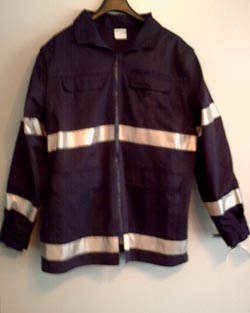 Anorak, fluoreszierendes leuchtrot (RAL 3024) mit schwarzem oder dunkelblauem Schulterkoller aus Trevira CS, Hovatex-Klimamembrane, 3M-Reflexstreifen silber umlaufend am Unterarm, Oberarm und Schulter, zwei innenliegende Brusttaschen mit Patte und Druckknöpfen, zwei aufgesetzte Seitentaschen mit Patte und Druckknöpfen, eine Ärmeltasche mit Patte und Klettverschluß, verdeckter 2-Wegereißverschluß, Taillienkordelzug, mit Reißverschluß einziehbares Thermosteppfutter, Kapuze im Kragenbund, nicht abtrennbar, Krageninnenseite schwarz, bzw. dunkelblau, Ärmelbündchen schwarz, bzw. dunkelblau mit Klettverschluß stufenlos verstellbar, Flauschband zum Anbringen eines Rücken- und Namenschildes,