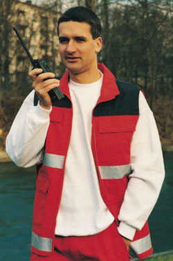 Sommerweste, rot oder marine, aus 65% Polyester/35% Baumwolle, 3M-Reflexstreifen silber, zwei innenliegende Brusttaschen mit Patte und Klettverschluß, zwei aufgesetzte Seitentaschen mit Patte und Klettverschluß, eine Innentasche links mit Reißverschluß, Flauschband zum Anbringen eines Rücken- und Namenschildes, Wasser- und Schmutz abweisend,